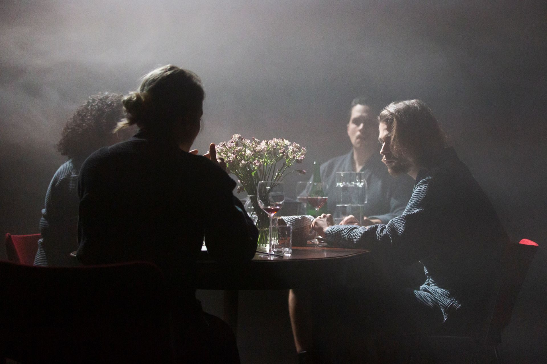 »Schon als das Publikum sich langsam im Vorraum sammelt, breitet sich nebenan, wo in den Landungsbrücken Frankfurt ohne erhöhte Bühne die Aufführungen stattfinden, Nebel aus. Bis zum Ende rund anderthalb Stunden später wird es neblig bleiben, außerdem düster, sodass die vier Darstellerinnen und Darsteller ein wenig oder ziemlich unscharf wirken, je nachdem, wie weit sie weg sind. Sie haben alle den gleichen Bademantel an, graublaues Pikee, dazu schwarze Springerstiefel. So sehr Marijke Wehrmanns Kostüme die vier gleichsam aus der Realität heben, so sehr man sich das prächtige Haus, in dem sie leben – mit dem großen Park drumrum und den spektakulären Sonnenuntergängen vor der Nase – komplett vorstellen muss, so tatsächlich setzen sie sich zwischendurch an einen großen Tisch, decken ihn, essen etwas, das nach dem vielerwähnten Boeuf Bourgignon aussieht, dazu Weißbrot (wie gut, freut sich die Mutter, dass sie alle Fleisch essen). Indessen ist, auf drei Seiten ums Spielfeld, das Publikum die „Freunde“, die immer mal angesprochen werden. Es handelt sich bei dieser Landungsbrücken-Produktion um die deutsche Erstaufführung eines Stückes der kanadischen Dramatikerin und Schauspielerin Evelyne de la Chenelière, „Zur Nacht“. Für ein Frankfurter Team um den Regisseur Kornelius Eich ist es der zweite Austausch mit der Theaterszene in Québec. Übersetzt wurde „Zur Nacht“ von Gerda Poschmann-Reichenau. Nebel also, in dem auch die Geschichte, die erzählt wird, unscharf bleibt, ausfranst ins Ungewisse, Mögliche. Gespenstische. Es kann zuletzt so oder so oder auch anders gewesen sein. Ein Unfall, eine Falle, ein Überfall, ein Selbstmord. [...] „Zur Nacht“ ist ein einerseits schlichtes, andererseits doppelbödiges Stück. Sprachlich verbindet Evelyne de la Chenelière Witz mit Bitterkeit und Poesie, so dass man geradezu versonnen wieder aus dem Nebel und in die Nacht stapft.«
